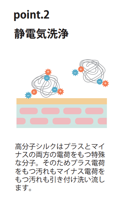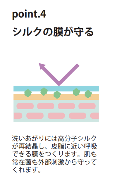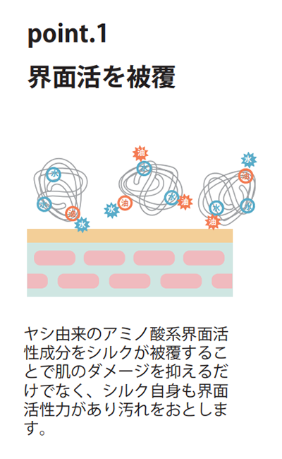シルクは汚れを吸着するだけなく、強すぎる洗浄成分をやわらげたり、肌を外部刺激から守ったり、常在菌の環境を整えたりするすぐれもの。