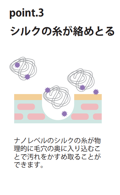 ② 極微小なシルクの糸と超純水が毛穴の奥に入り込み汚れをキャッチします。